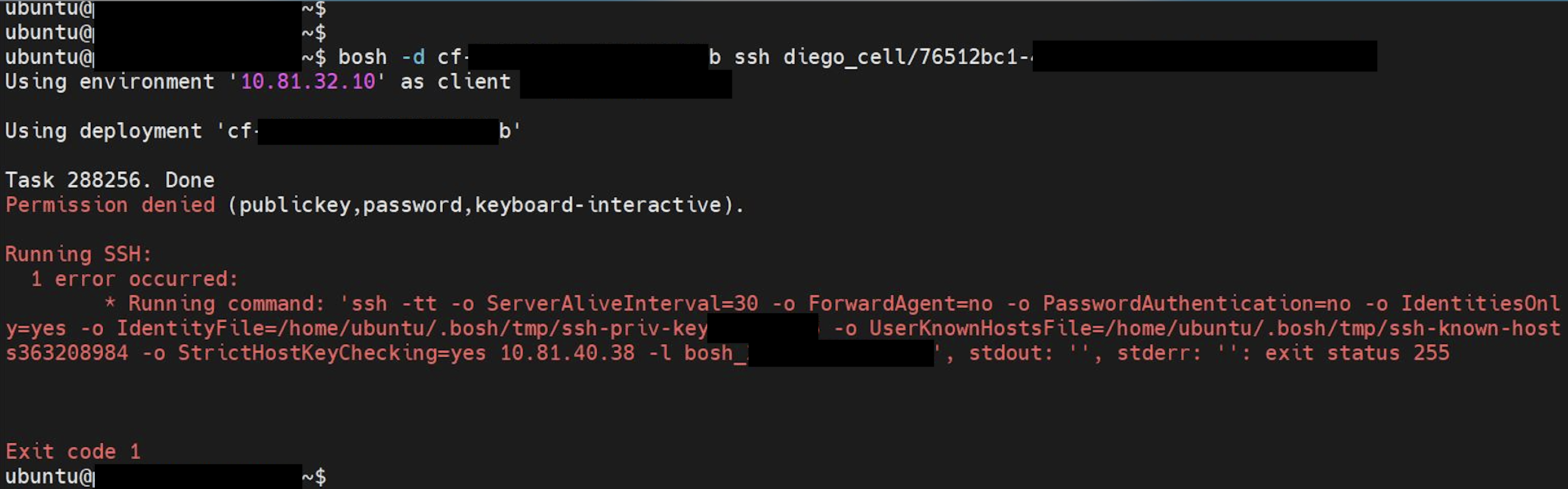 5. Logout from the Diego cell and try "bosh ssh" with it again.