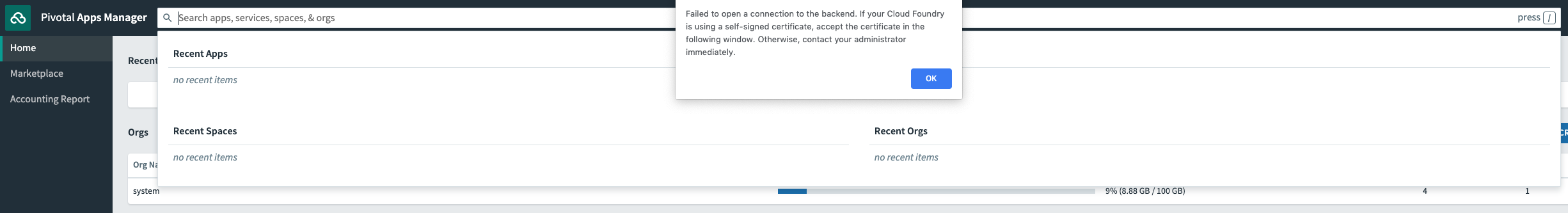 Search bar functionality in Apps Manager was expanded in TAS 2.5 and all versions released to August 22, 2019. A WebSocket is used as a solution to efficiently stream large numbers of search results so the users will not have to wait until all results from the search comes back.