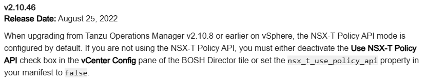 This is a breaking change starting with Opsmanager 2.10.46. Where the Director setting to use the NSX Policy API is enabled by default. This can break Concourse pipelines of earlier versions, because it was not a necessary parameter. Unless you are using the NSX-T Policy API, you will need to update your pipeline to set: nsx_t_use_policy_api: false