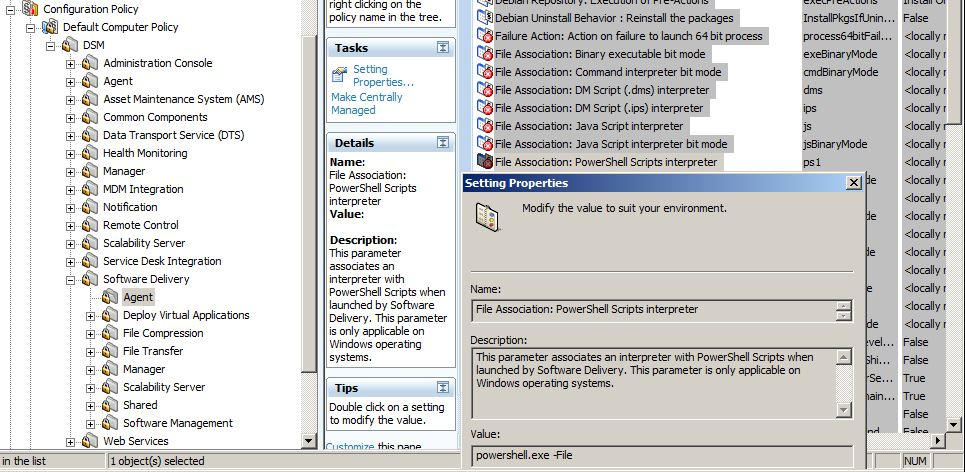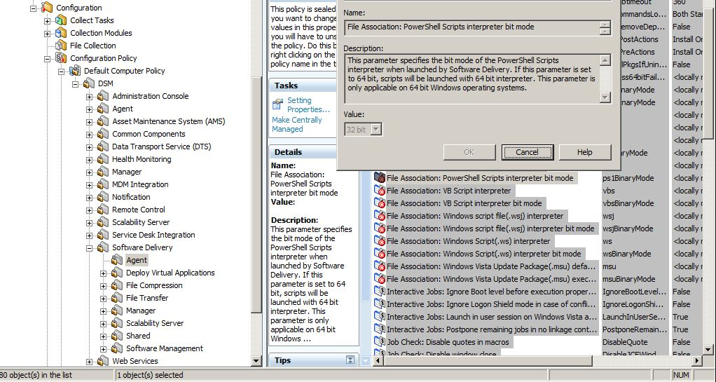 Next, for 64bit Windows agents, configuration policy needs to specify if the 32bit or 64bit of the Powershell interpreter needs to be used. This is listed in DSM > Software Delivery > Agent > Fie Association: Powershell Scripts interpreter bit mode, by default set to 32bit mode.