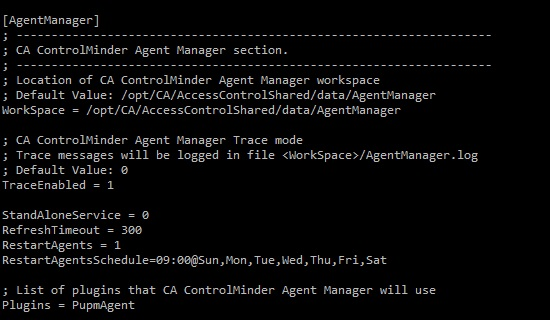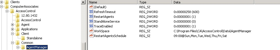 On Windows Servers you will need to edit the registry hive HKEY_LOCAL_MACHINE\SOFTWARE\ComputerAssociates\AccessControl\Common\AgentManager and create two new keys. The first key a REG_ DWORD for the name RestartAgents. This token has two main values of 0 (zero) or 1. 1 means this token is enabled. The second key is a REG_SZ for RestartAgentSchedule. It's value is 00:[email protected],Tue,Wed,Thu,Fri,Sat in order to set the schedule.