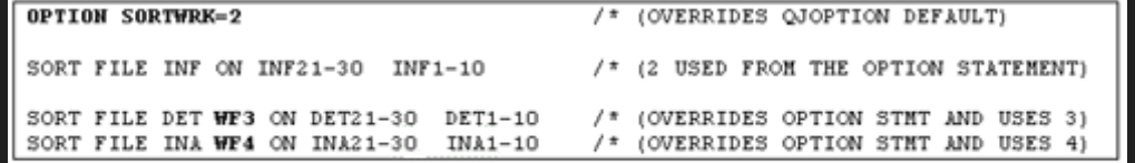 The OPTION statement in the program below sets the number of sort files to '2' and is used in the first SORT statement for the INF file, then the WF workfile sort specifications in the last two SORT statements are used for the DET and INA files respectively.
