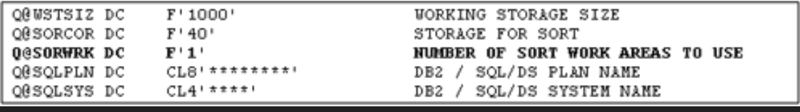 The default QJOPTION assembly shows that the number of sort work files is set to one.
