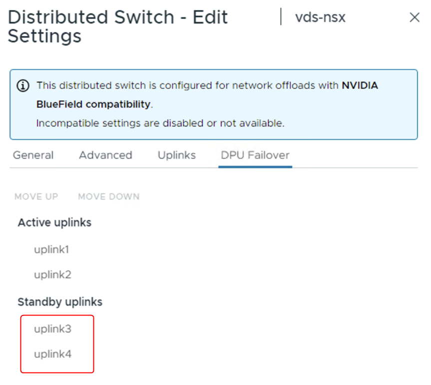 Edit the DPU Failover Settings and move the uplink3 and uplink4 to Standby uplinks.