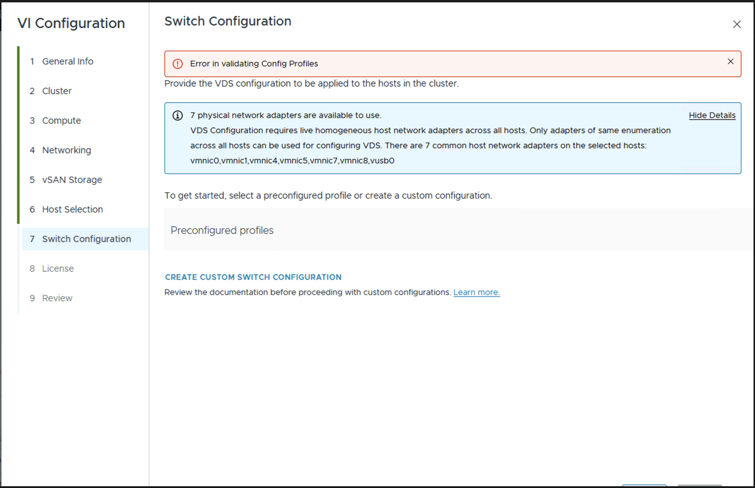 Once done for all the hosts, launch Add VI workload / Add cluster workflow and the issue should no longer be present in switch configuration page.