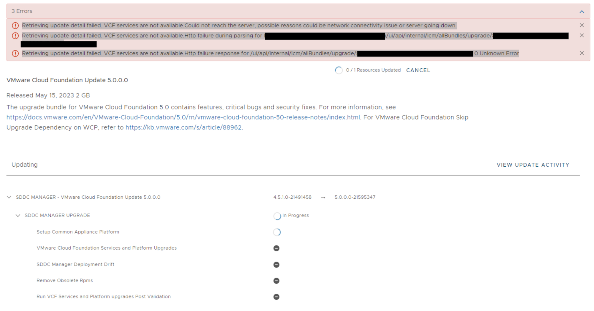 During the SDDC Manager upgrade, after bundle packages are applied, services gets restarted(Backend and UI), which brings the server down and up after a while. During this downtime, APIs won't be reachable, and due to that UI display errors on the UI(upgrade-sddc-manager-error.png)