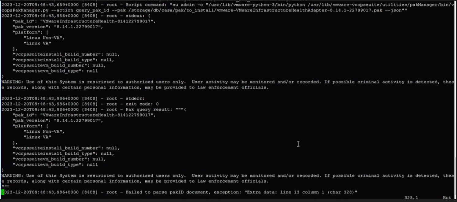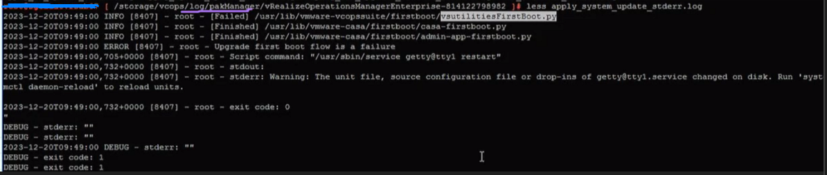 VMware Aria Operations Upgrade Failure at Stage 9 of 14 with error "Failedresource key=pak_manager.action_failed, resource args=[run admin firstboot scripts]"