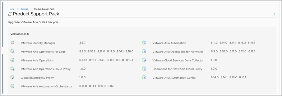 | VMware Aria Suite Lifecycle | 8.16.0 - 23334789 | 8.16.0-23377566 | Upgrade to the new build, 8.16.0; it will be a build-to-build upgrade. If your Suite Lifecycle is already on version 8.16.0, there will not be any version change. For those who have not upgraded yet, follow the same path as before. Ensure to carefully read the release notes if you are upgrading from older versions to the new one. |