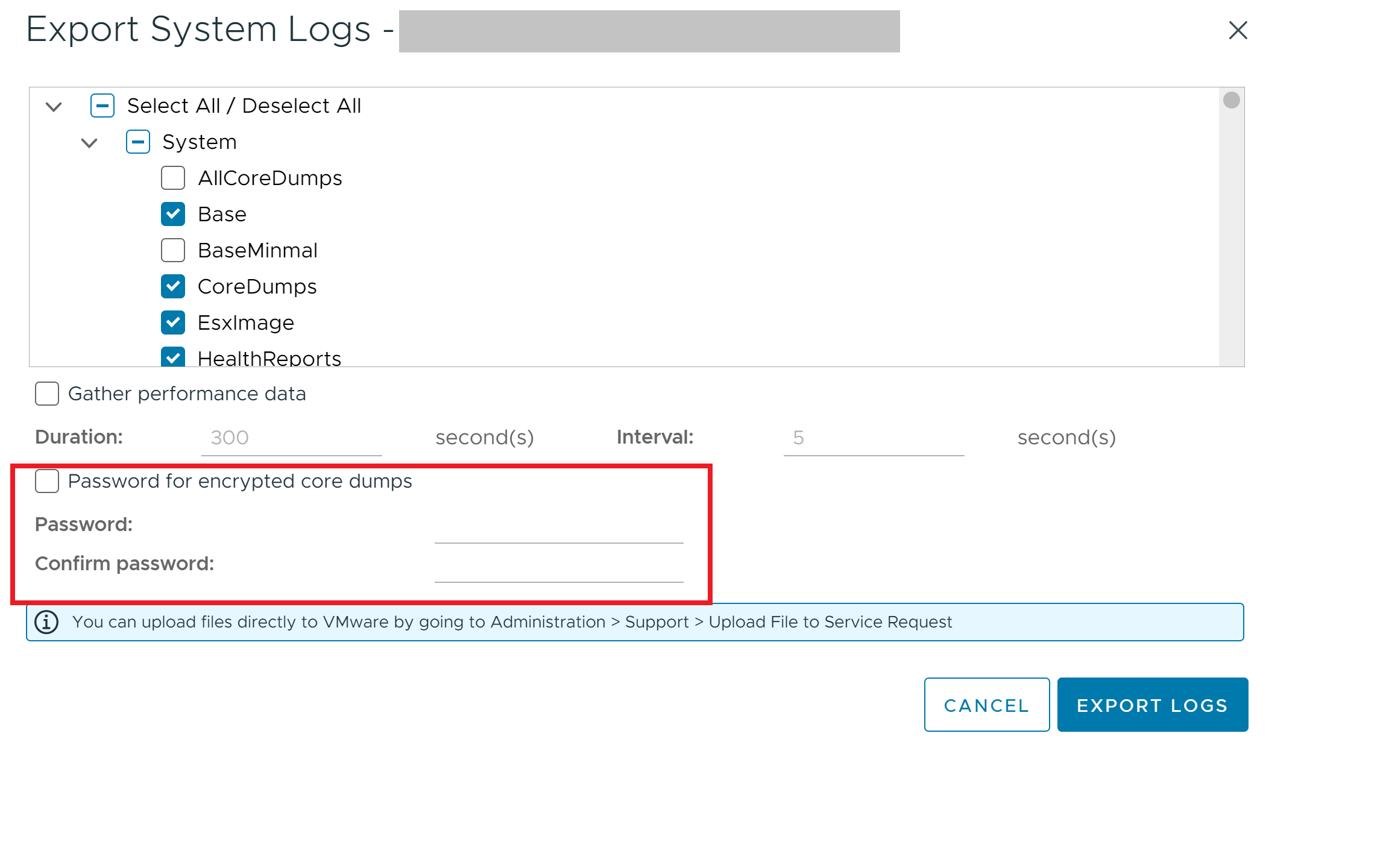 When collecting host logs, do so from vCenter and be certain to set a password in the wizard. This password will then need to be provided to VMware TSE to be decoded after upload.