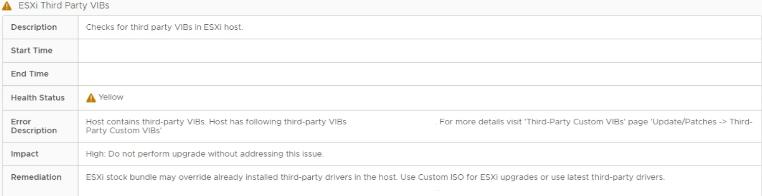 Please validate the listed VIBs and its corresponding software. If the VIBs are not actively using the software, they may choose to remove it and proceed with the upgrade normally. Else, suggest to consult Vendor support for further guidance.