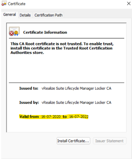 Log Insight SSL Certificate will expire in -x days2022-10-17 07:11:17.989 INFO [http-nio-8080-exec-7] c.v.v.l.l.c.CertificateStoreController - - - Starting certificate generation2022-10-17 07:11:17.990 INFO [http-nio-8080-exec-7] c.v.v.l.l.s.p.CertificateStoreService - -- Inside certificate store service2022-10-17 07:11:18.422 ERROR [http-nio-8080-exec-7] c.v.v.l.l.c.CertificateStoreController - -- Failed to generate certificate.com.vmware.vrealize.lcm.common.exceptions.InvalidCertificateException: Validations failed for certificate.Open an SSH session to the vRSLCM appliance as root and check the certificate by running the below commands
