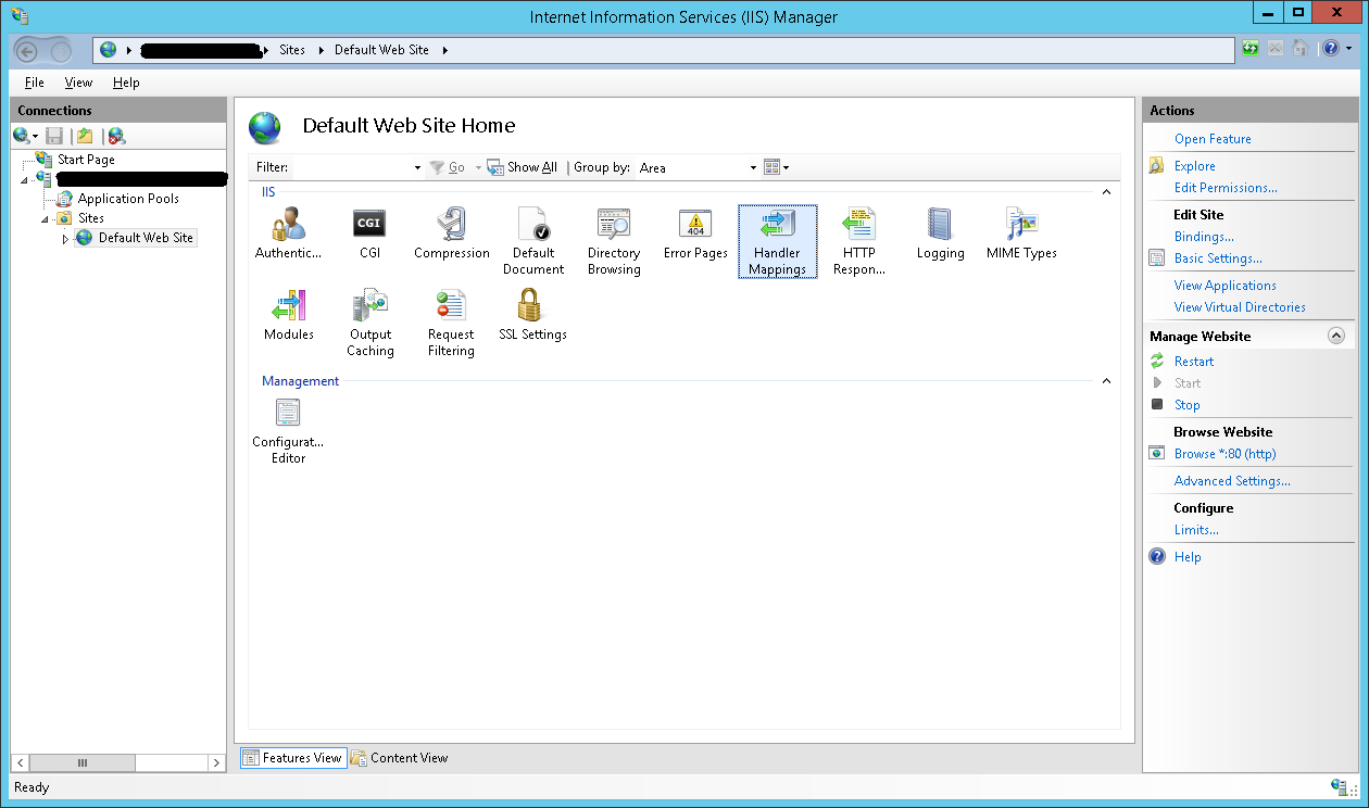 13. Drill down on the left-hand side of the window to access "Default Web Site", then choose "Header Mappings" on the right-hand side of the window.