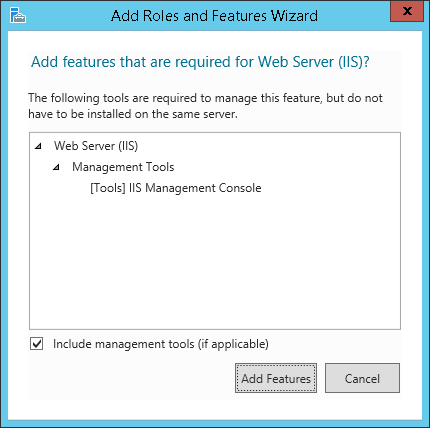 5. You will receive a message advising to "Add features that are required for Web Server (IIS)". Make sure "Include management tools (if applicable)" is checked ON, then click "Add Features".