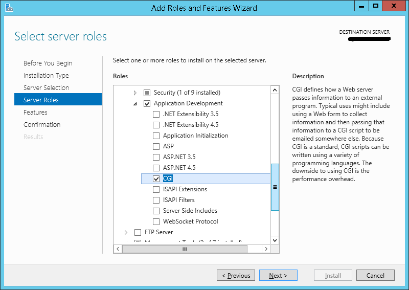 9. Scroll down and select/open "Web Server (IIS)" and install "Application Development" and "CGI"