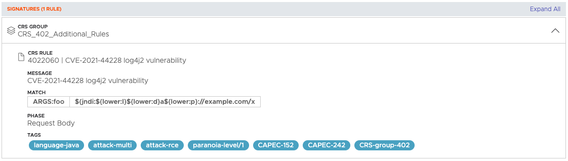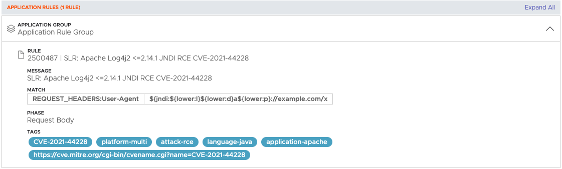 SecRule REQUEST_LINE|ARGS|ARGS_NAMES|REQUEST_COOKIES|REQUEST_COOKIES_NAMES|REQUEST_BODY|REQUEST_HEADERS|XML:/*|XML://@* "@rx \${(?:jndi|ctx):" "id:4099843,phase:2,block,t:none,t:lowercase,t:urlDecodeUni,multimatch,msg:'CVE-2021-44228 / CVE-2021-45046 log4j vulnerability', tag:'attack-rce', tag:'paranoia-level/1', severity:'CRITICAL'"