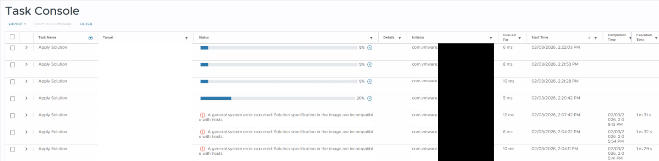 Host not compatible with the image"Downgrades of manually added Components in the desired ESXi version are not supported.Downgrades of ESXi components <Component name> are not supported.VMware vCenter Server 8.x