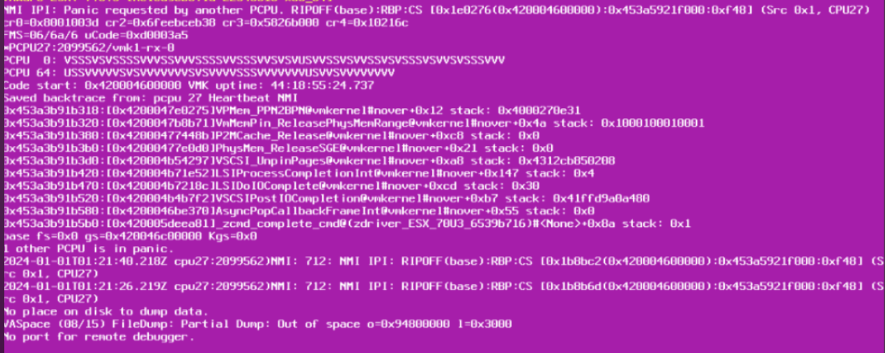 #0 Panic_WithBacktrace (sbt=sbt@entry=0x4303ba005118, fmt=fmt@entry=0x420004bf3e68 "NMI IPI: Panic requested by another PCPU. RIPOFF(base):RBP:CS [%#lx(%#lx):%#lx:%#lx] (Src %#x, CPU%u)") at bora/vmkernel/main/panic.c:147