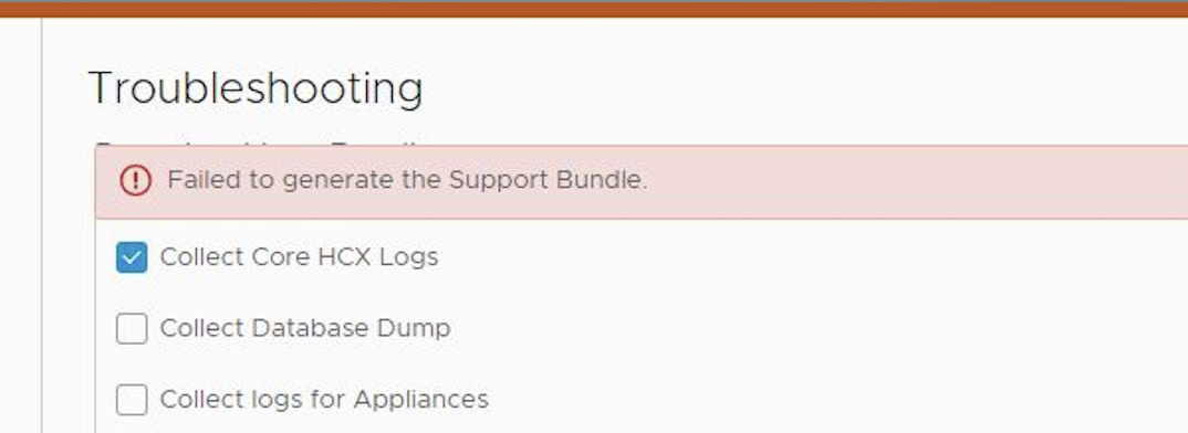 HCX Manager UI >> Administration >> Troubleshooting >> Collect Core HCX Logs) from the regular HCX Manager UI (https://<HCX_manager_IP>:443) a "Failed to generate the Support Bundle." error is seen in the UI .