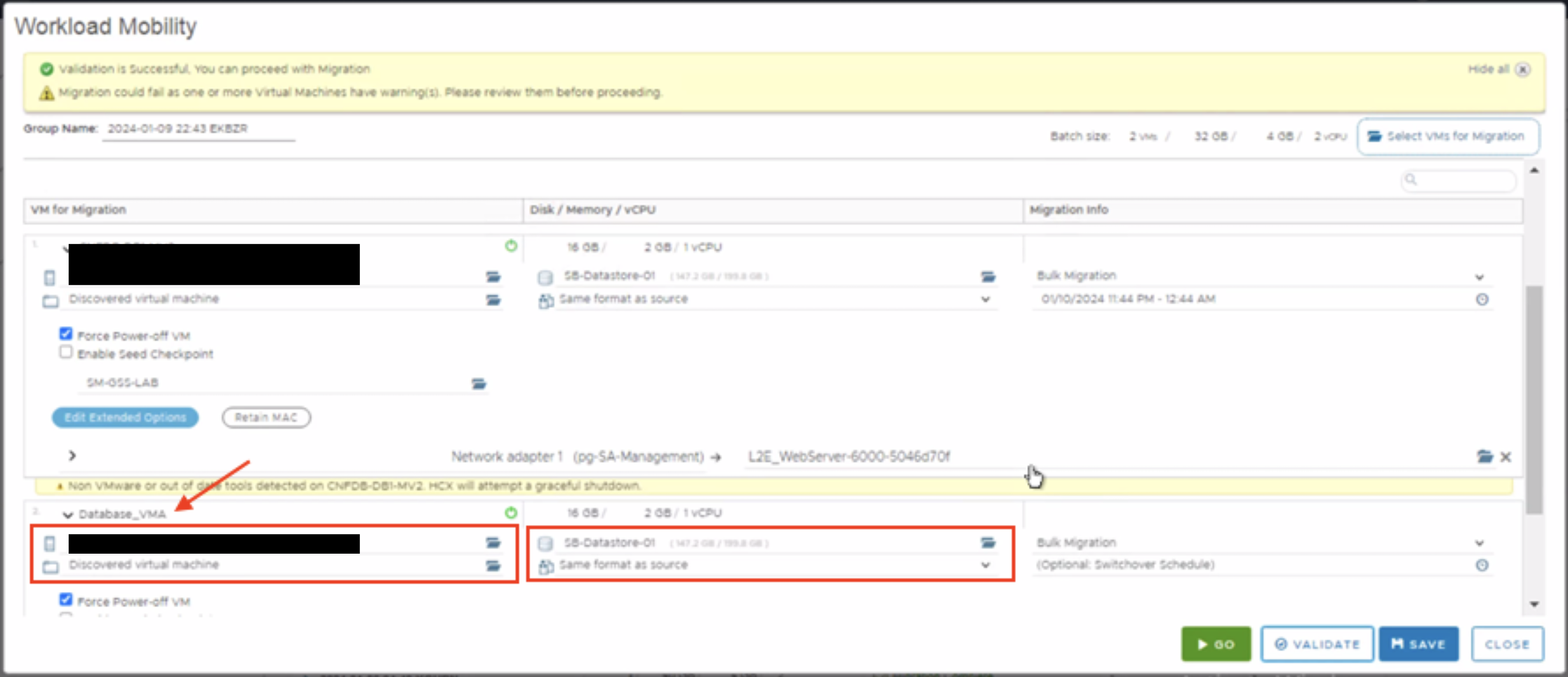 In the following screenshot an HCX migration mobility group is created successfully with two or more VMs. Global values for placement, switchover, interconnect and extended options are selected and saved. The global datastore and folder options are displayed for each individual VM within the migration group