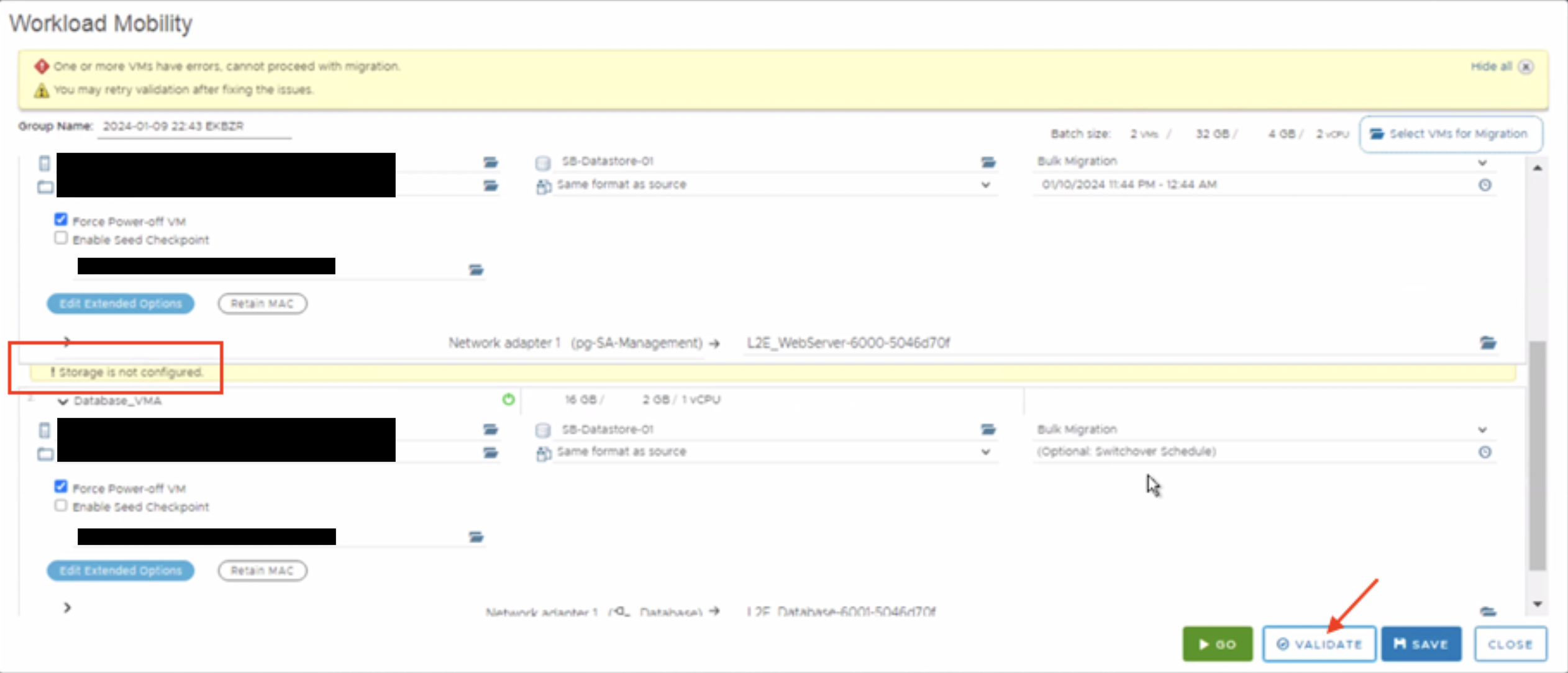 When running validation, an error is seen for all VMs in the group that the storage option was not configured