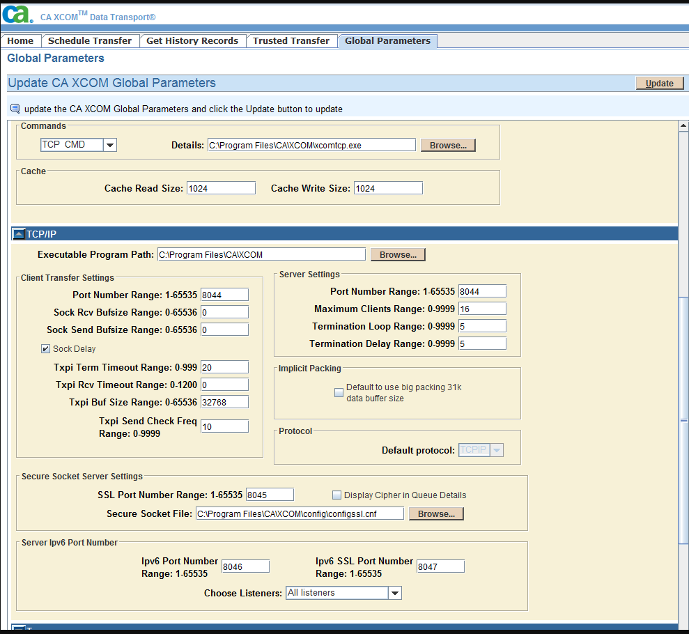 On Windows the XCOM Listener ports can only be set in the GUI on the Global Parameters tab. After they are entered, they are not written into the xcom.glb file, but are written directly into the registry at location: HKEY_LOCAL_MACHINE\SOFTWARE\ComputerAssociates\XCOM\CommunicationServer.