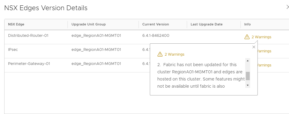 The above screenshot is the WARNING message displayed when the hosts/clusters are not upgraded, and you hover over the WARNING alerts from the NSX Edges.
