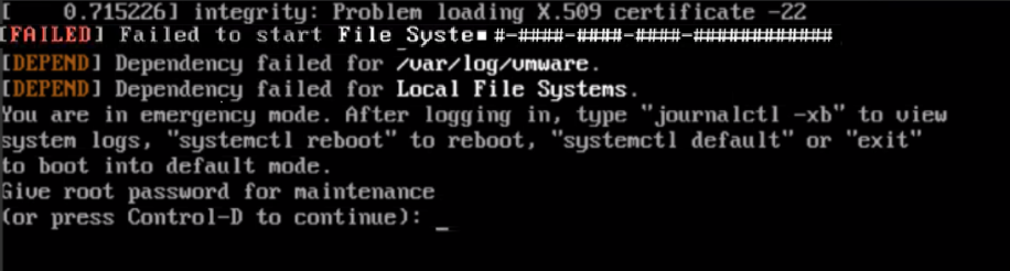 [FAILED] Failed to start File System 0-a2d7-4c0a-###-8c1d##83acf[DEPEND] Dependency failed for /var/log/vmware.[DEPEND] Dependency failed for Local File Systems.You are in emergency mode. After logging in, type "journalctl -xb" to view system logs, "systemctl reboot" to reboot, "systemctl default" or "exit"During emergency mode, a 'Dependency failed' error may be displayed for a specific mount point, such as the /storage/log directory: