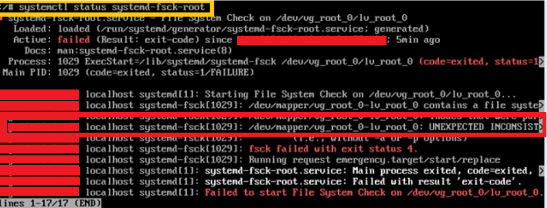 [FAILED] Failed to start File System Check on /dev/vg_root_0/lv_root0[DEPEND] Dependency failed for /sysroot.[DEPEND] Dependency failed for Initrd Root File System.[DEPEND] Dependency failed for Reload Configuration from the Real Root.