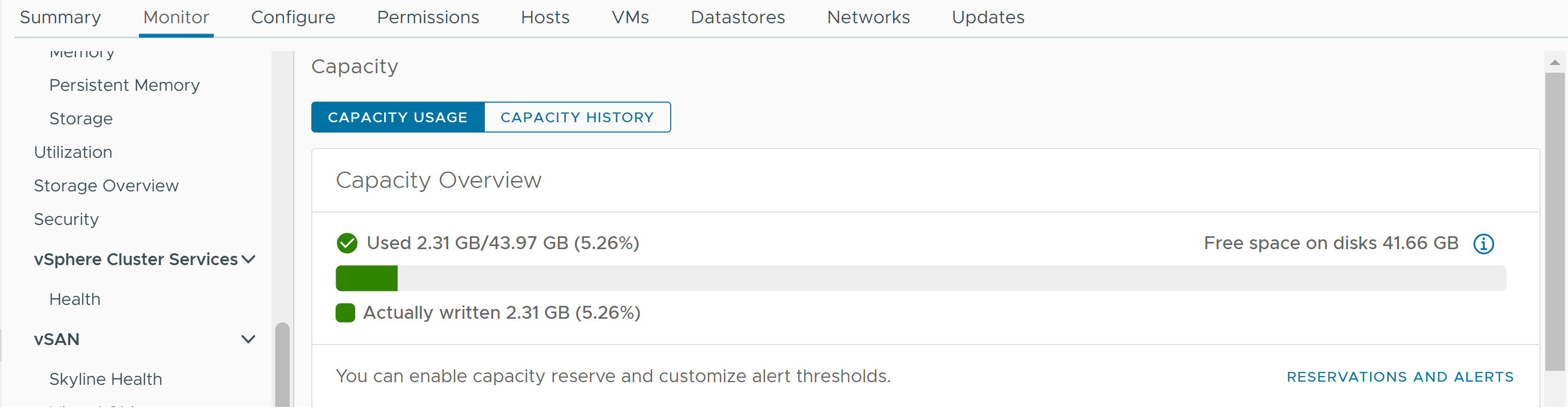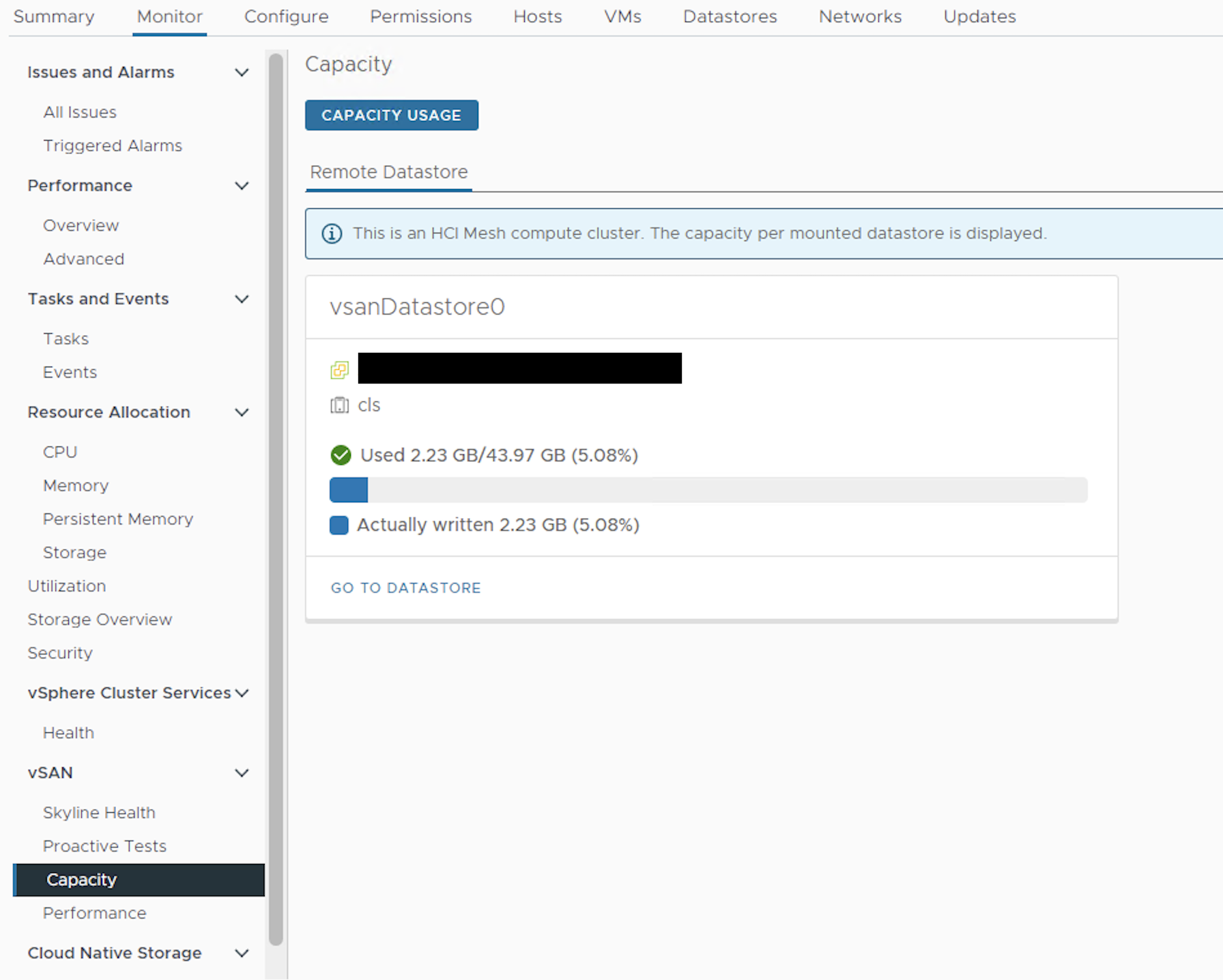 Due to performance considerations, capacity usage data will not be refreshed on every byte usage change on the client cluster for the remote vSAN datastore(s). The capacity usage gap between the capacity UI on the client cluster and the one on the server cluster will typically be off by 1GB.