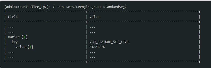 The workaround will add markers in service engine group using CLI Commands. Run below CLI based commands to set STANDARD tag.