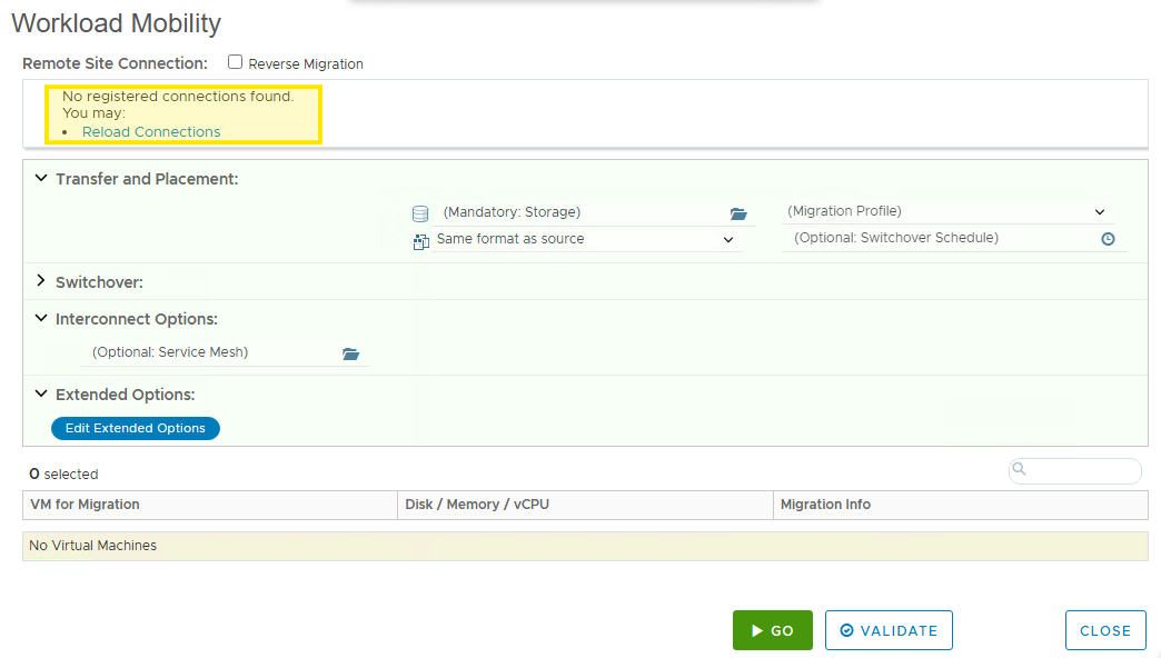 While attempting to schedule Migrations from the HCX Cloud Manager web interface, the migration wizard displays the message: "No registered connections found."