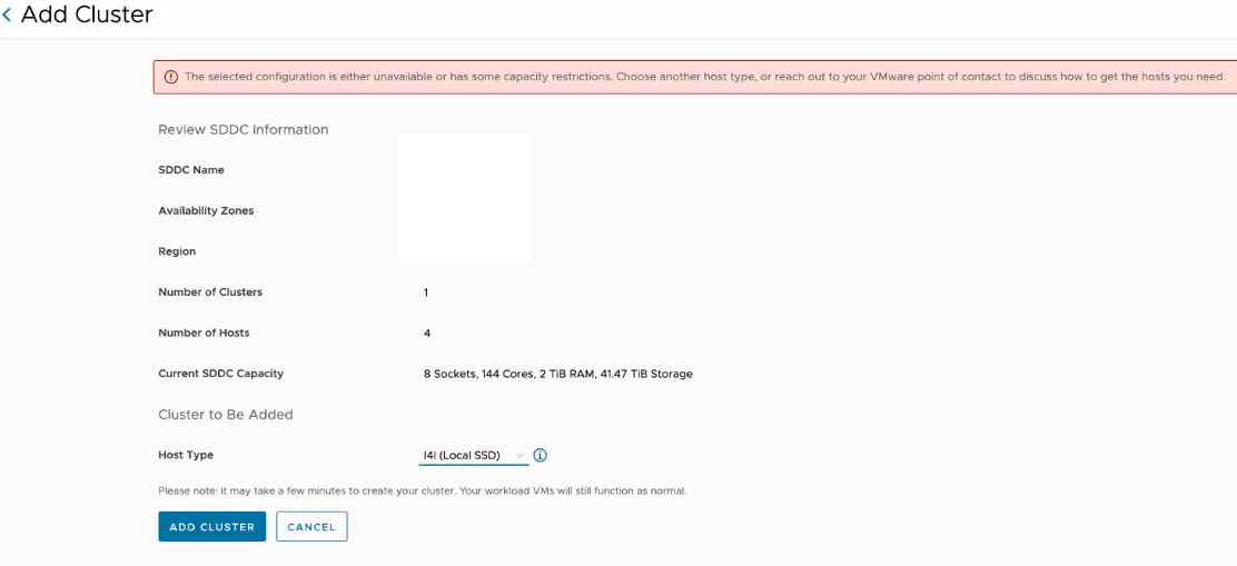 Impact/Risks: You will be unable to deploy a new SDDC/Cluster using i4i.metal instance type. You will be able to deploy other instance types without issue.