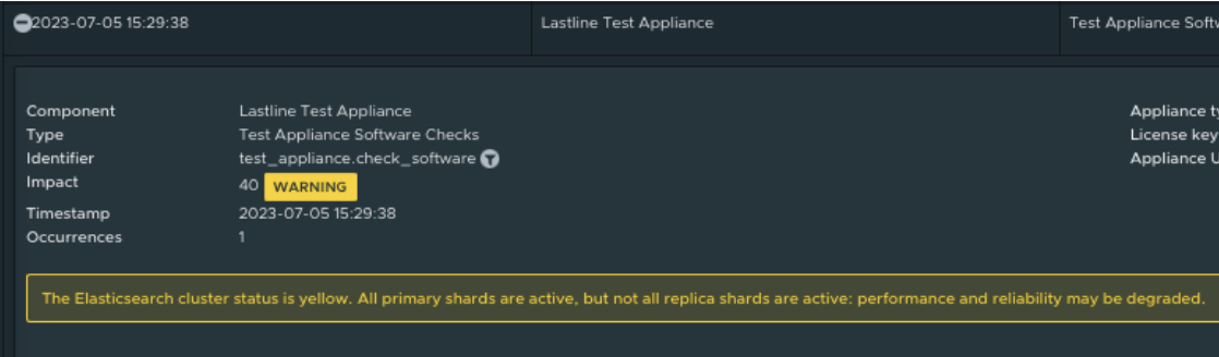 For the other scenario of "DanglingIndicesState", the elastisearch status reported yellow and you would see in output of lastline_test_appliance