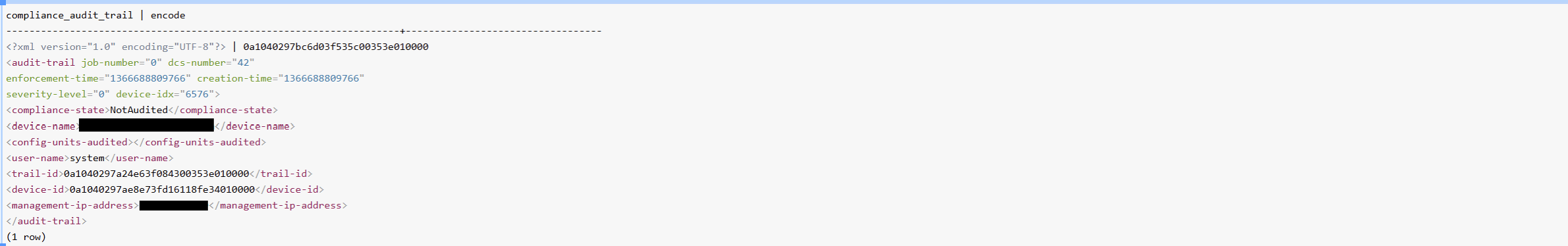 select cm_device_audit_history.compliance_audit_trail,encode(cm_device_audit_histo ry.history_id,'hex') from cm_device_audit_history where cm_device_audit_history.compliance_audit_trail LIKE '%audit-trail%';