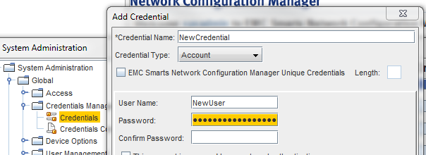 This is a display artifact. The password length is not limited to the number of mask characters that can be displayed distinctly in dedicated password input fields. The data type into which encrypted passwords are written in the underlying Smarts NCM PostgreSQL Control Database is BYTEA (a byte array), which effectively places no significant limits on the length of a valid password stored in Smarts NCM. Similarly, the Smarts NCM interface password field can accept a far longer series of characters than it is able to display.