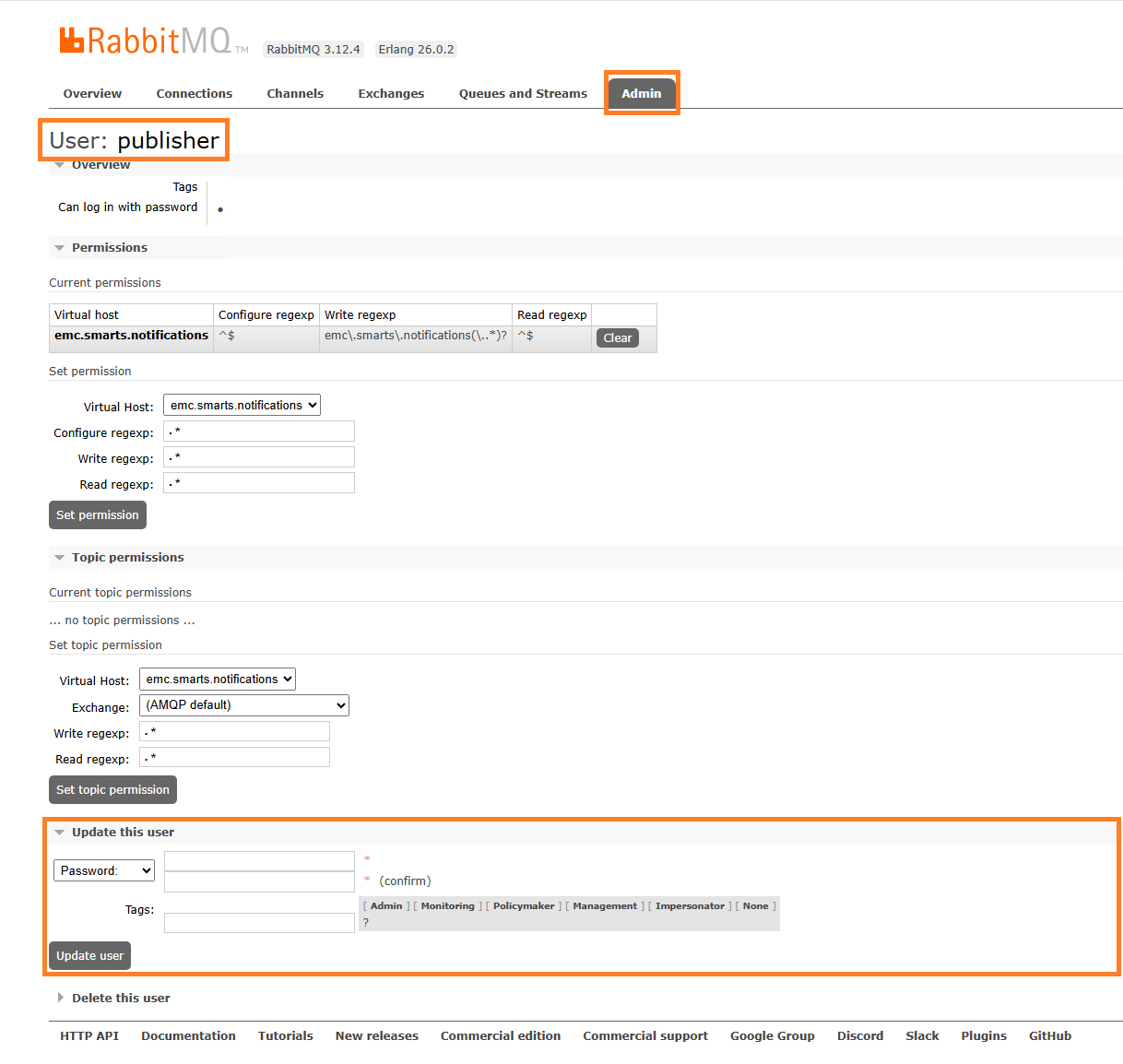 The RabbitMQ login for this process is publisher with the default password of changeme.