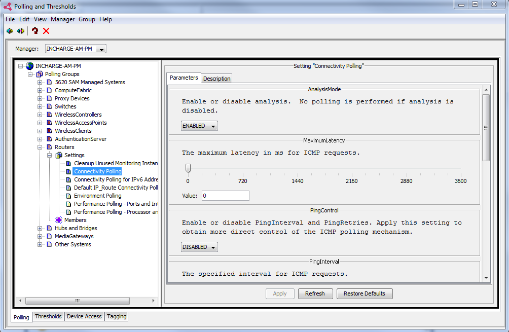 The ICMP latency monitoring feature is not enabled by default. The ICMP latency monitoring feature is enabled and configured through the Connectivity Polling setting in the Smarts IP Polling and Thresholds console.