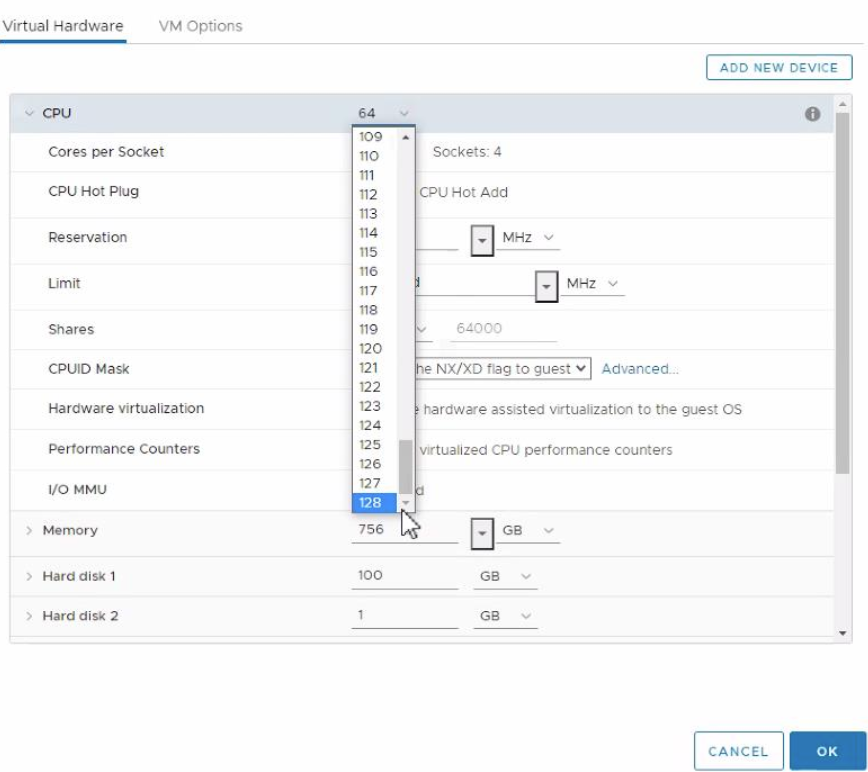 To obtain values beyond 128 when assigning CPU on a VM, we need to choose a combination of the following options. If any of the options below are not met, we may not see values exceeding 128.