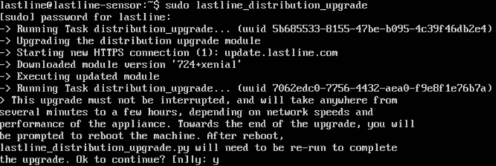 Note: Upgrading across multiple distributions is not recommended and is extremely time-intensive. If you are on a distribution older than Xenial, to avoid problems, we recommend migrating to a fresh Lastline Bionic 18.04 version by installing the system from scratch using the latest ISO file.