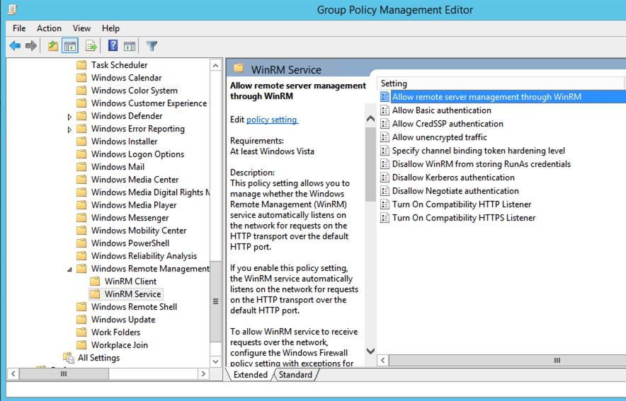 4. Go to Computer Configuration > Policies > Administrative Templates > Windows Components > Windows Remote Management (WinRM) > WinRM Service.