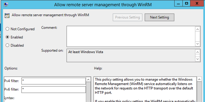 5. Double-click the setting Allow remote server management through WinRM. Select Enable and type in * in for both IPv4 filter and IPv6 filter.