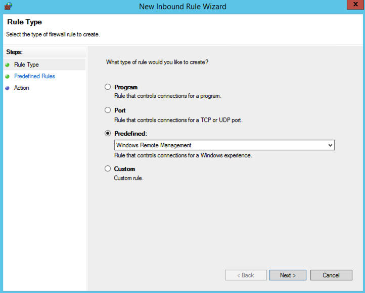 9. Select Predefined: option and choose Windows Remote Management from the list (not the one with compatible). Click Next.