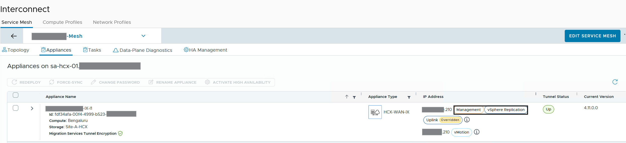 This issue occurs in HCX when the IX appliance on the Service Mesh is configured for both management and vSphere replication. However, on the on-prem ESXi host where the IX appliance is running, there are separate vmkernel adapters for vSphere replication and management traffic.