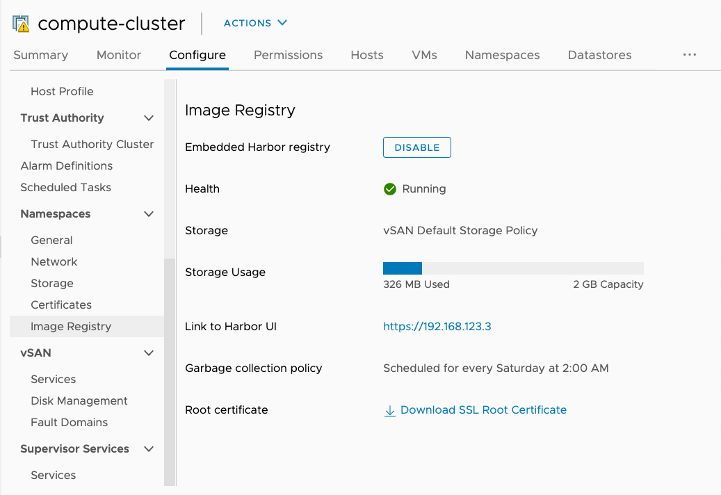 - Login to the vsphere UI, navigate to the Image Registry option under Configure tab for the cluster and click on Download SSL Root Certificate to save the registry CA certificate to local and save it as ca.crt.