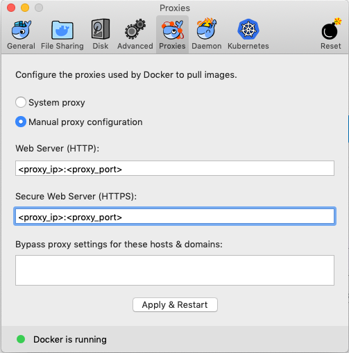 - Add the proxy IP and port to the manual proxy configuration for docker as well