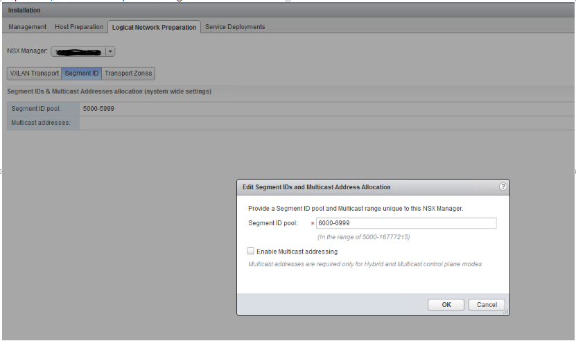On the Web Client go to Networking and Security -> Installation -> Logical Network Preparation -> Segment ID (tab) -> click the appropriate NSX manager.