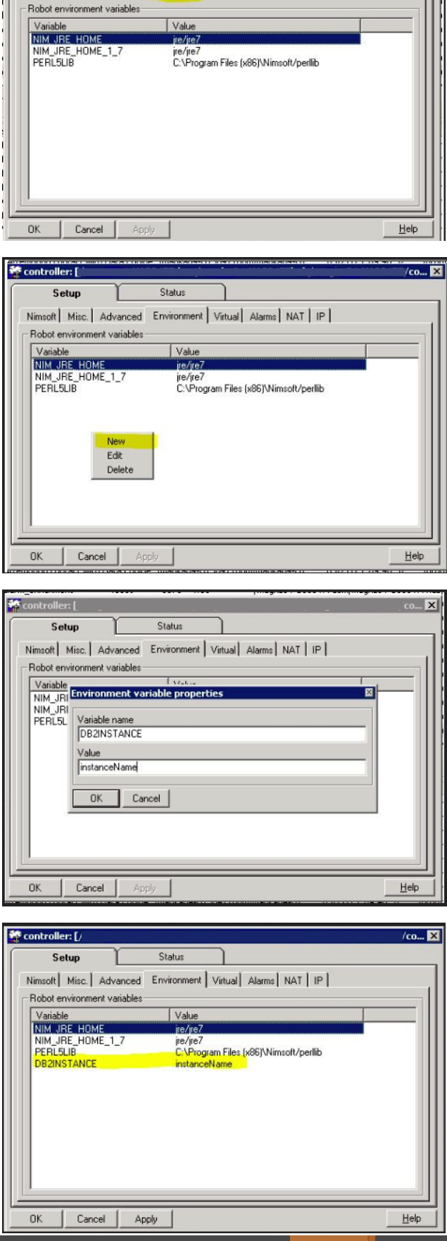 In the robot environment where the db2 probe is installed, set the variable DB2INSTANCE to any existing instance on the monitored DB2 server in the robot environment.