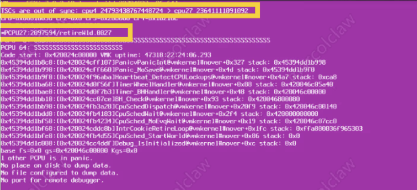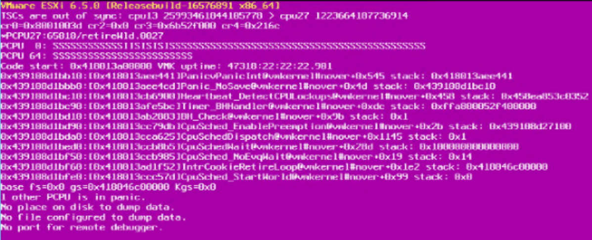 #YYYY-MM-DDT19:25:37.078Z cpu26:65562)World: 2778: PRDA 0x418046800000 ss 0x0 ds 0x4018 es 0x4018 fs 0x4018 gs 0x4018