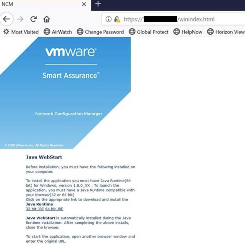 When user is trying to access GUI via URL https://<NCM_Server_IP> on client machine and clicks on “Launch VMware Smart Assurance Network Configuration Manager”, Java detection error is observed as below:The required Java Run Time might not have been installed/enabled on the client machine and/or Java Web Start is not getting picked by the browser.