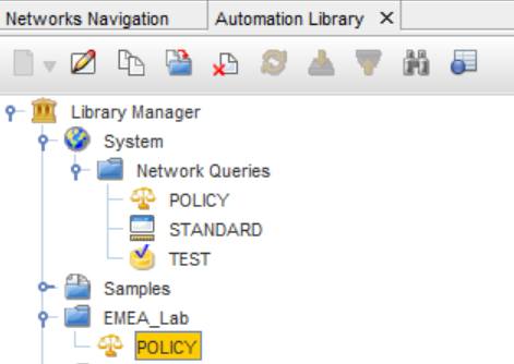 Now when policy (POLICY) is copied to network (here it is EMEA_Lab), it copies its standard and test however both will not be visible in copied network. See screenshot below: